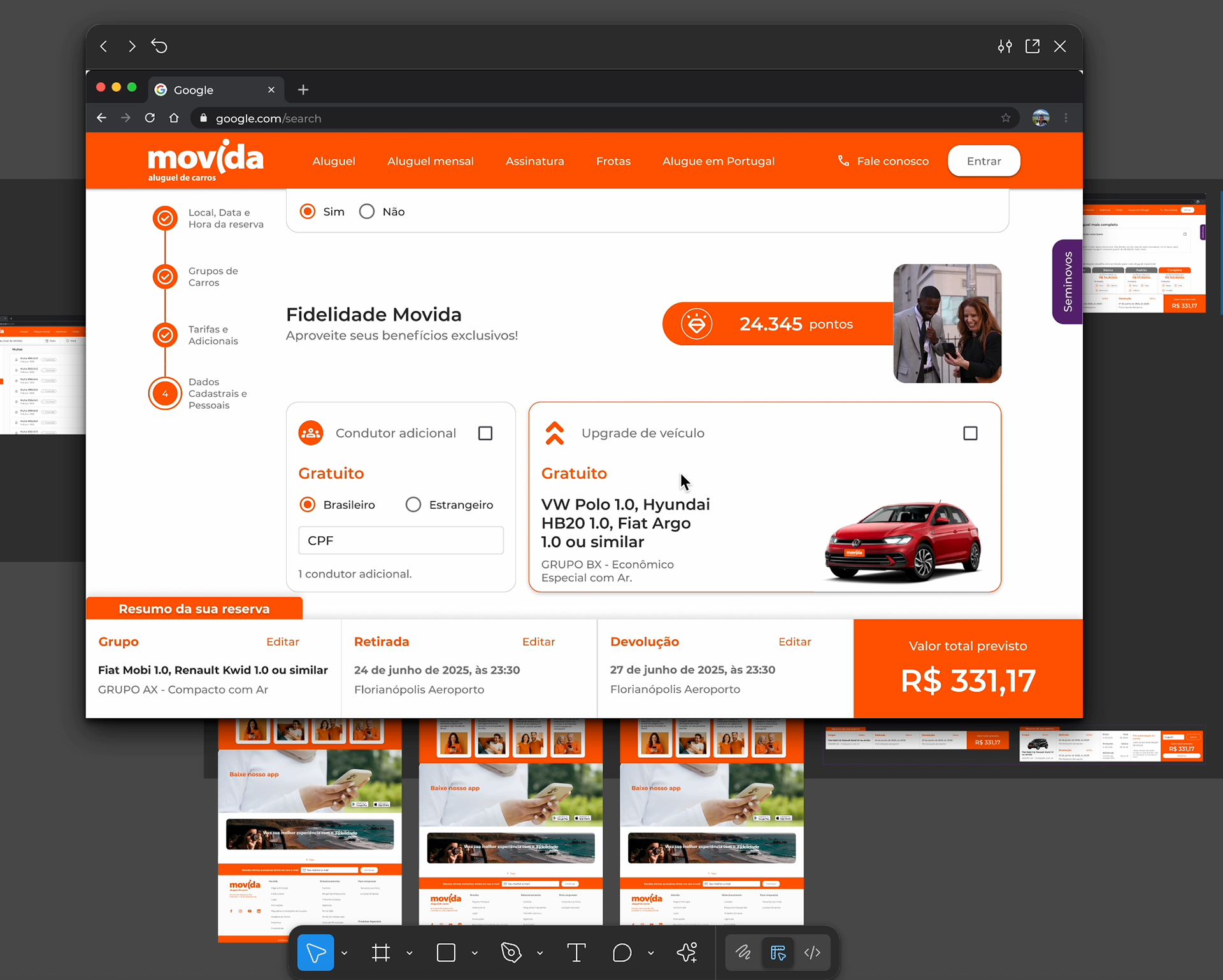 Ao fazer uma reserva, os usuários podem ver em tempo real como seus pontos afetam o preço total. Isso incentiva o uso ativo de recompensas e reforça a sensação de valor em permanecer fiel à Movida.